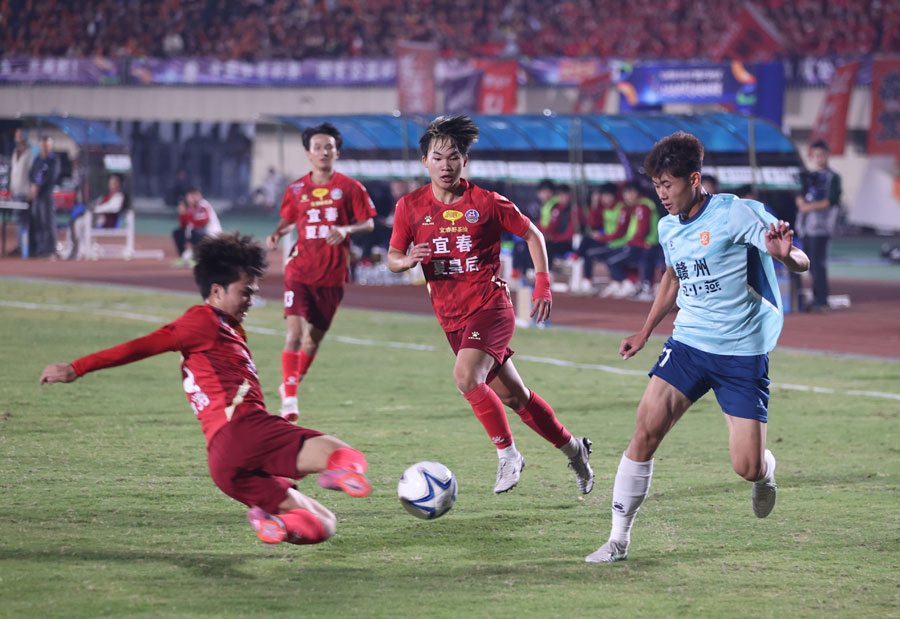 10月25日晚,备受瞩目的“运动赣鄱·活力江西”2025江西省城市足球超级联赛决赛首回合激情开打。经过90分钟激战,最终赣州队凭借28号卢欣的梅开二度,2∶0力克对手,在比赛中抢得先机。图为两队球员在激烈拼抢。记者邹忠辉 摄