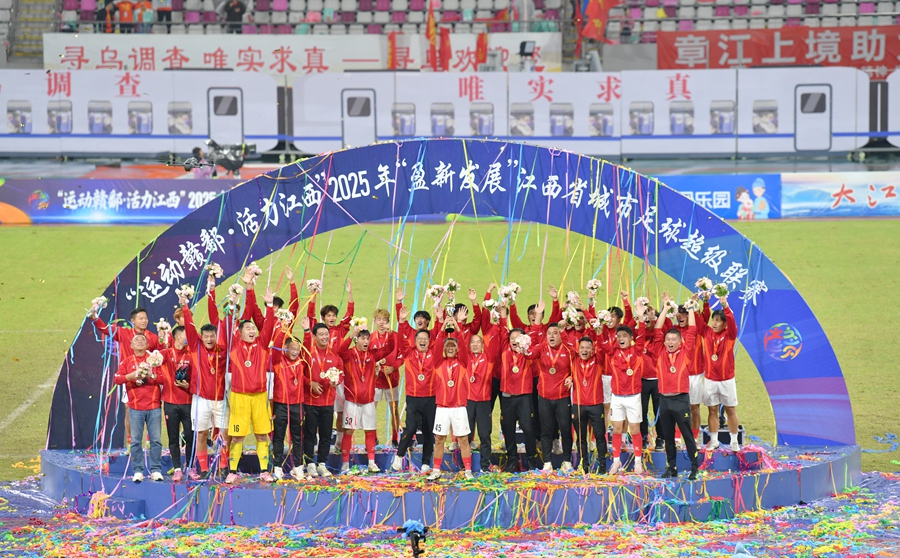 11月2日,冠军赣州队在颁奖仪式上庆祝。当日,在江西赣州举行的2025江西省城市足球联赛(“赣超”)决赛中,赣州队最终两回合总比分3比0战胜宜春队,夺得冠军。记者欧艳芬 摄