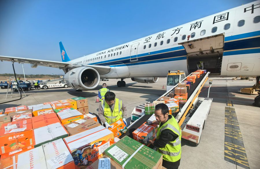 12月11日,赣州黄金机场,工作人员通过传送带将一箱箱赣南脐橙装入航班。近年来,赣州依托“航空货运+电商”模式,打通脐橙外销快车道,实现24小时送达全国主要城市。作为当地农户增收的支柱产业,赣南脐橙正借力航空运力加速“出圈”。截至11月底,机场已运输脐橙1000吨,预计全年将突破2200吨。 邱万柏 摄