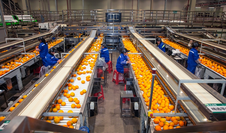 近日,在农夫山泉信丰工厂内,工人借助智能化流水线对脐橙进行分选、加工。近年来,信丰县大力发展脐橙精深加工,依托产业的传统优势与品牌积淀,推出脐橙酒、脐橙精油等多款精深加工产品。2025年,全县脐橙种植面积28.5万亩,预计年产量28.6万吨,产业集群总产值突破70亿元。马文杰 摄