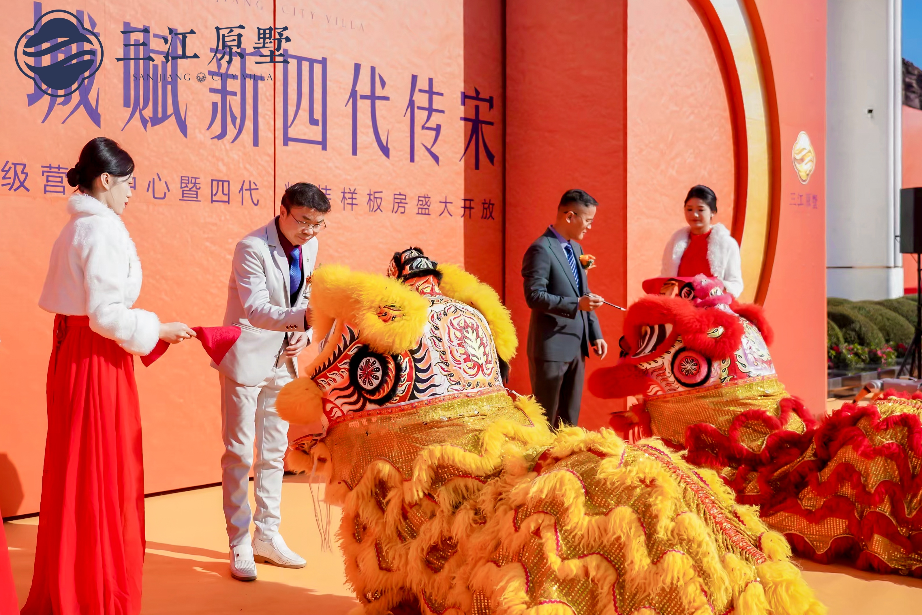 传统舞狮点睛与剪彩仪式精彩绝伦。领导执笔点睛,祥狮纳福,金剪落定,宣告三江原墅正式迎来全城品鉴。现场礼花齐放,掌声雷动,寓意项目红火启程。