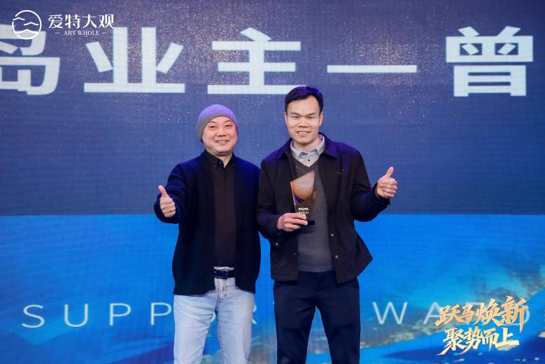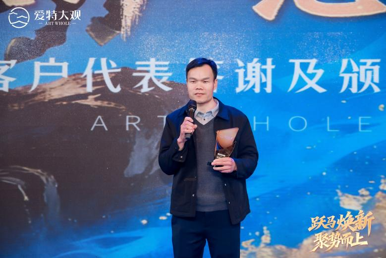 在温馨而隆重的氛围中,致敬同心力量、共话荣耀征程的颁奖仪式就此拉开帷幕。感恩于心,更当致敬每一份同心筑梦的磅礴力量。晚宴之上,赣州爱特大观总经理高鑫先生为老客户曾海军先生郑重颁发“最佳支持奖”,以表对其对品牌的认可与陪伴的诚挚谢意。曾先生随后深情开讲,回顾与爱特大观携手走过的历程,从初期的信任萌芽,到项目推进中的默契无间,字里行间皆是对爱特大观专业实力与服务精神的高度赞誉。这不仅是客户对品牌的肯定,更是口碑的坚实基石,如无形纽带,将爱特大观与客户紧紧相连,也鞭策着爱特大观在未来以更优质服务回馈客户厚爱。