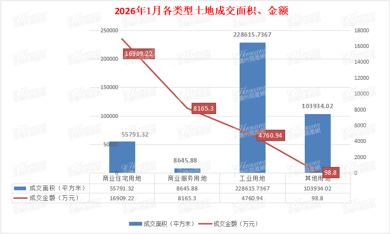 2026年1月赣州全市土地成交总金额29934.26万元(约2.99亿元),成交总面积396986.9567㎡(约595.48亩),其中商业住宅用地1月份共成交16909.22万元(约1.69亿元),成交面积55791.32㎡(约83.69亩)。商业服务用地1月份共成交约8165.3万元(约0.82亿元),成交面积8645.88㎡(约12.97亩)。工业用地1月份共成交4760.94万元(约0.48亿元),成交面积228615.736666667㎡(约342.92亩)。其他用地1月份共成交98.8万元(约0.01亿元),成交面积103934.02㎡(约155.9亩)。
